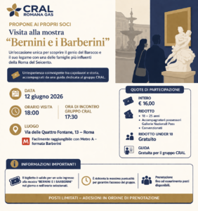 Il CRAL Romana Gas propone ai propri soci una visita alla mostra “Bernini e i Barberini”, un’occasione unica per scoprire uno dei protagonisti assoluti dell’arte barocca
