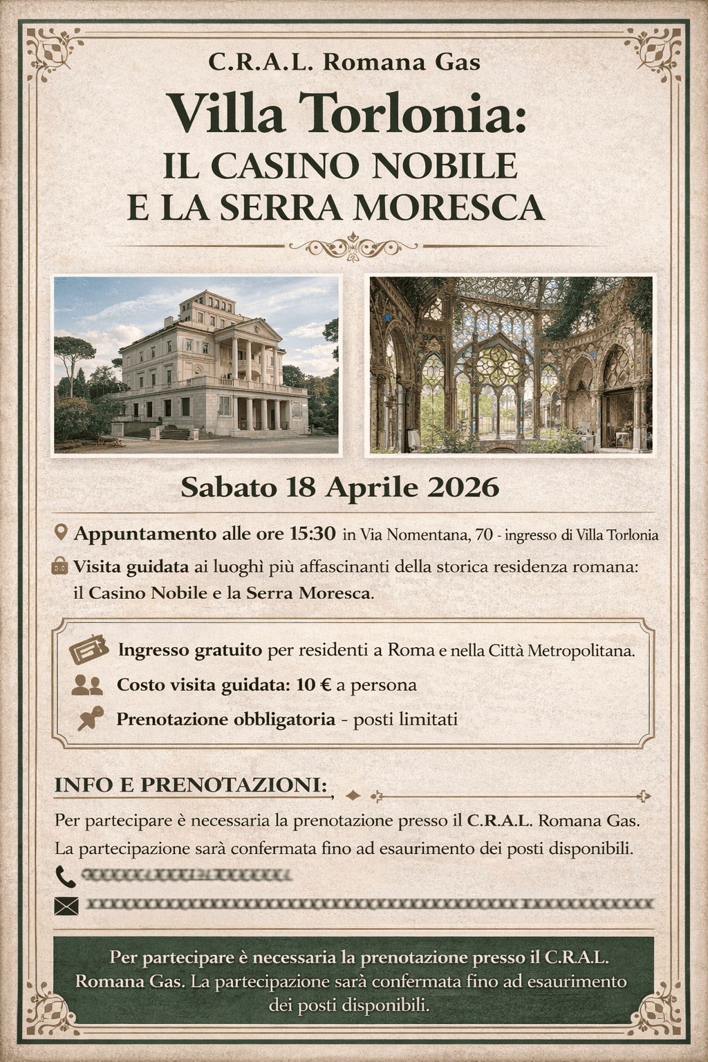 Il C.R.A.L. Romana Gas propone una visita guidata alla scoperta di uno dei complessi più affascinanti della capitale: la storica villa romana Villa Torlonia.